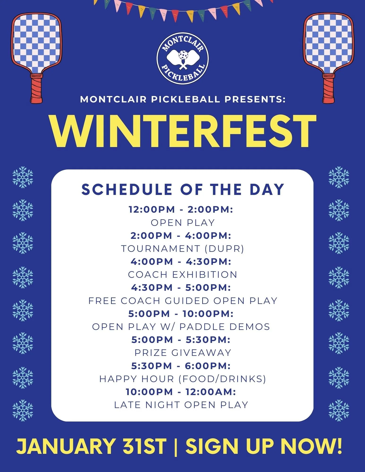 Join this one-of-a-kind, all-day winter pickleball party - an event you’ll be thankful you attended (and regret it if you didn’t!). Designed for pickleball lovers of every kind (doubles partners, tournament rivals, pickleball families, solo picklers, and everyone else), this is a celebration you won’t forget. Enjoy open play throughout the day (organized by level), a mini tournament, advice from pros, an exhibition, food, free drinks, music, exciting giveaways, and so much more!